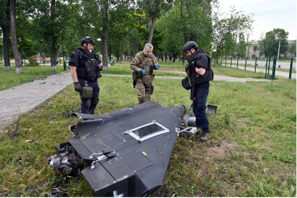 “Harkiv’deki bir hava saldırısının ardından Ukraynalı patlayıcı uzmanları ve polis memurları, Shahed 136 tipi askeri dronun parçalarını inceliyor.”