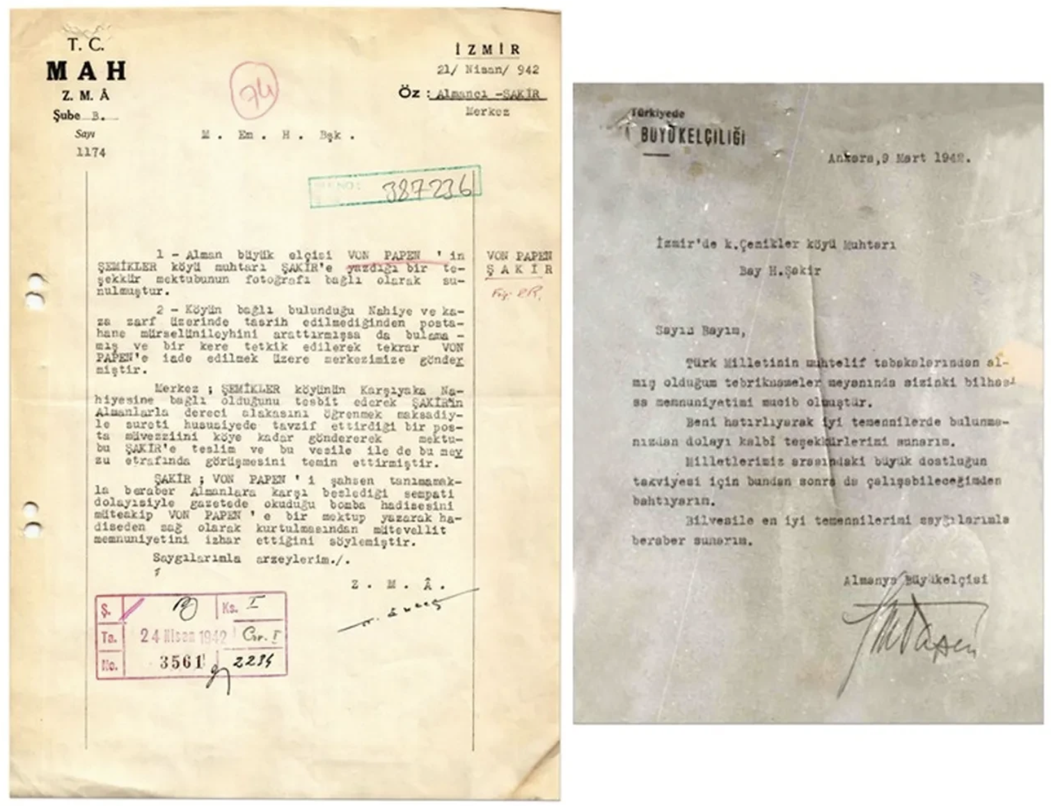 Öte yandan MİT belgeleri arasında yer alan diğer önemli bir döküman ise 1942 yılında Alman Devlet Adamı ve diplomat Franz Von Papen’in, İzmir Karşıyaka Şemikler köyü muhtarı Şakir’e yazdığı 9 Mart tarihli mektup oldu. Von Papen, Türk halkının çeşitli kesimlerinden tebrik mektupları aldığını anımsatarak, Şakir’in mektubunun kendisini özel olarak memnun ettiğini ve iki millet arasındaki dostluğun güçlendirilmesi yönünde çalışmaya devam edeceğini ifade etti.