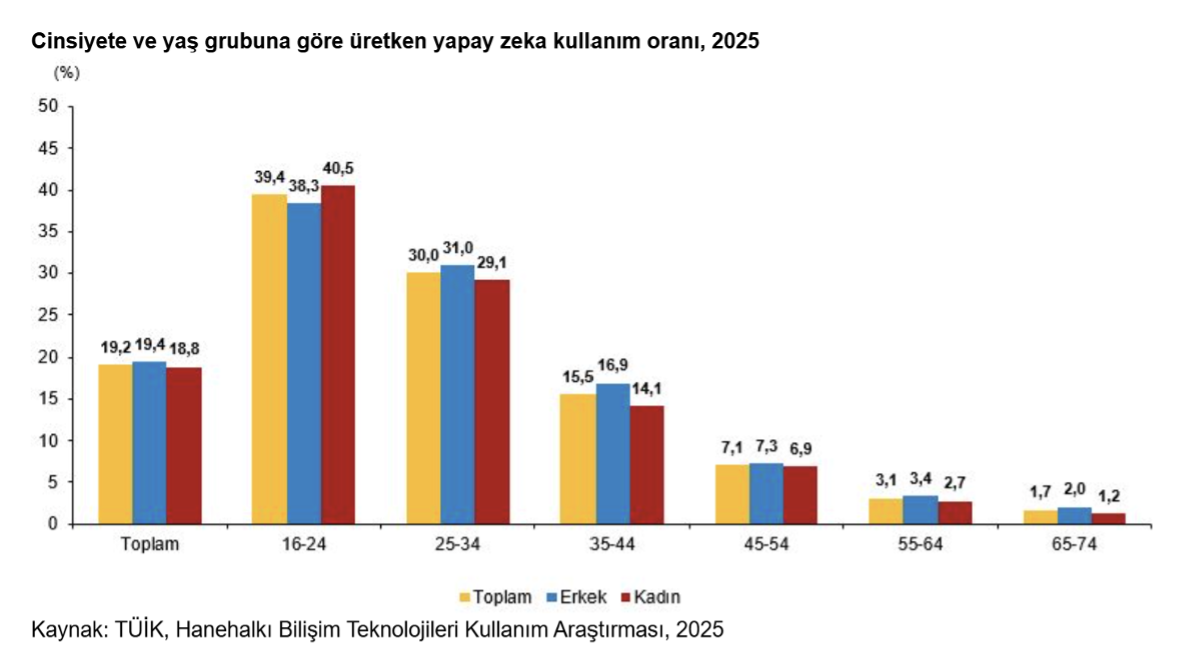 Bireylerde yapay zekayı aktif kullananların oranı yüzde 19,2. Erkeklerde yüzde 19,4, kadınlarda yüzde 18,8. En yüksek kullanım yüzde 39 ile 16-24 yaş grubunda gözlemlendi. Yaş ilerledikçe oran hızla düşüyor. Eğitim seviyesi yükseldikçe yapay zeka kullanım oranı da artıyor: üniversite mezunlarında yüzde 36, lise mezunlarında yüzde 22, ortaokul mezunlarında yüzde 17 ve ilkokul mezunlarında sadece yüzde 2,2.